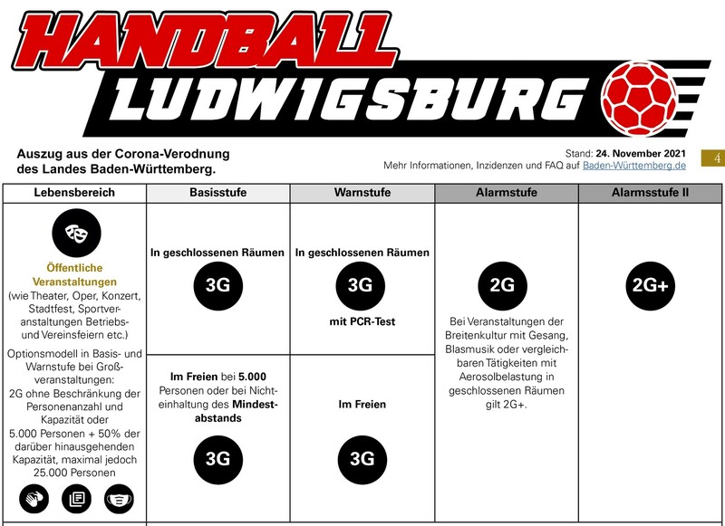 mit Erreichen der Alarmstuffe II gilt entsprechend der Corona-Verordnung des Landes-Badenwürttemberg seit 24.11.2021 die 2G+ Regelung für Veranstaltungen. Davon ist auch der komplette Spielbetrieb der HB Ludwigsburg betroffen. Für alle Spiele der HB Ludigsburg müssen Zuschauer mit Dauerkarten als auch Tagesticket zusätzlich zur 2G Regel (Genesen oder Geimpft) einen negativen und tagesaktuellen Antigen- oder PCR-Test einer offiziellen Teststelle nachweisen. Alle Nachweise sind nur in Verbindung mit einem Personalausweis gültig. Ohne diese Nachweise ist ein Zutritt zu den Sportstätten für Zuschauer leider nicht möglich. Diese Regelung gilt für alle Sportstätten der HB Ludwigsburg und für alle Aktiven- und Jugendspiele. Bitte haben Sie dafür Verständnis und befolgen Sie ggf. die Anweisungen an der Eingangskontrolle. Wir freuen uns natürlich über jeden Besuch und über Ihre Unterstützung bei den Spielen, trotz der für Sie erschwerten Bedingungen.