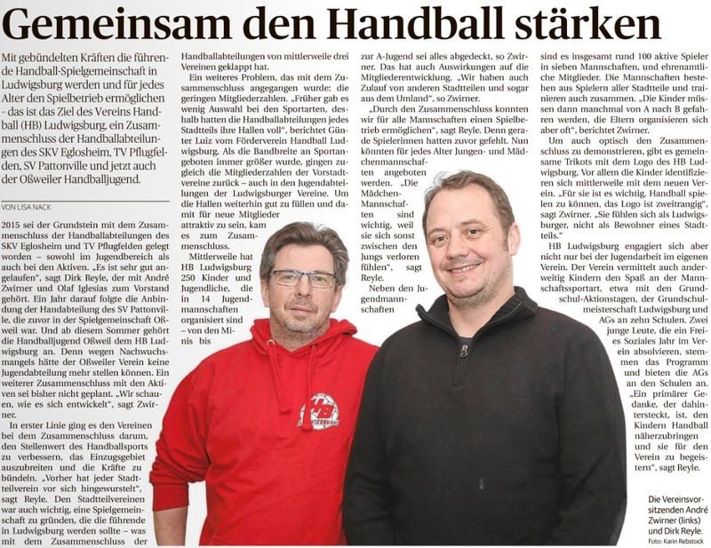 Mit Ende der Hallenrunde 2017/2018 wechseln die Kinder und Jugendlichen des SV Oßweil zur HB Ludwigsburg. Da es beim SV Oßweil immer schwieriger wurde alters- und leistungsgerechte Mannschaften stellen zu können, wurden Gespräche mit dem Vorstand und der Jugendleitung der HB Ludwigsburg geführt. Für beide Seiten ist es wichtig, den Kindern weiterhin Spaß und Freude am Handballsport zu vermitteln und ihnen auch künftig die Möglichkeit zu bieten, diesen ausüben zu können. Deshalb hat man sich schnell auf eine Zusammenarbeit geeinigt. Bei der bereits sehr guten Jugendarbeit der HB Ludwigsburg werden zukünftig fünf weitere Jugendtrainer aus Oßweil mitwirken.