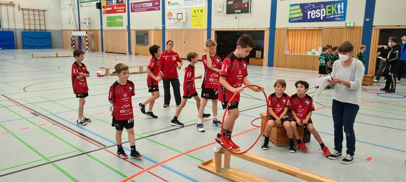 Nach Absolvieren der drei Koordinationsstationen traf man sich dann auf dem Handballfeld, bevor es zu Funino (Nebenspielform „FuNino 3 gegen 3“) ging.
