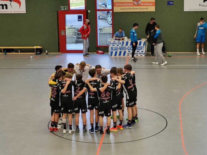 Sichtlich stolz über die auf dem Spielfeld erbrachte Leistung – sowohl auf Seiten der Mannschaft und beim Trainerteam als auch bei den mitgereisten Fans – wurde der völlig verdiente 32:27 Auswärtssieg in Bittenfeld bejubelt. Auch wenn es nicht mehr für Platz eins in der Staffel gereicht hat, dürfen alle Beteiligten zufrieden sein. Das Spiel in Bittenfeld hat gezeigt, wie attraktiv und unterhaltsam Jugendhandball sein kann (wozu bei allem Überschwang übrigens beide Mannschaften in diesem Spiel beigetragen haben).