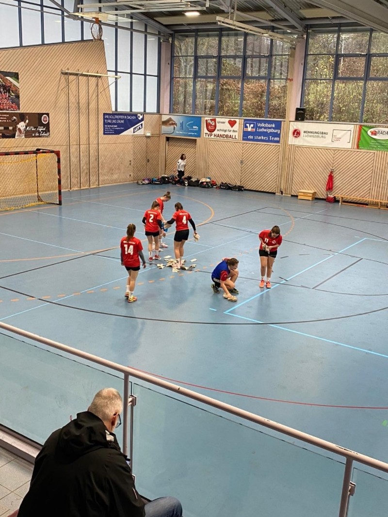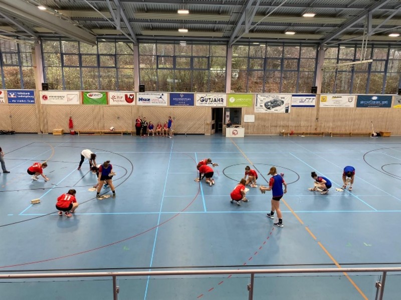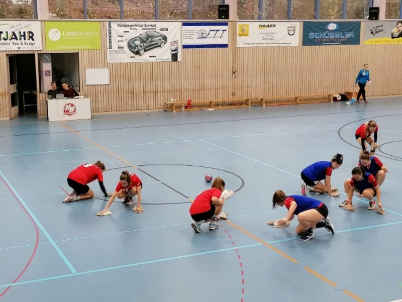 Das war aber nicht alles, kurz vor Spielende haben unsere Mädels ein paar der Gegnerinnen und natürlich auch die Schiedsrichterin eine kurze Showeinlage ihrer Putzkünste geliefert. Da es einen plötzlichen Wetterumschwung gab, also uns die Sonne nicht mehr blendete und man die Dachfenster für einen guten Luftdurchzug geöffnet hatte, begann es plötzlich in die Halle zu regnen. Zusammen haben sie den Hallenboden aber schnell wieder getrocknet und die letzten 5 Minuten konnten beginnen.